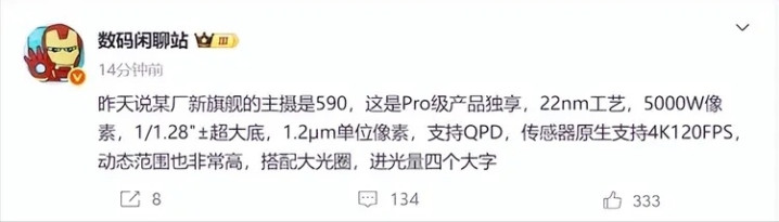 近日,数码博主“数码闲聊站”曾爆料称,“昨天说某厂新旗舰的主摄是590,这是Pro级产品独享,22nm工艺,5000W像素,1/1.28"±超大底,1.2μm单位像素,支持QPD,传感器原生支持4K120FPS,动态范围也非常高,搭配大光圈,进光量四个大字”。结合该博主此前曝光的信息来看,该机很可能来自华为Mate 80 Pro版。